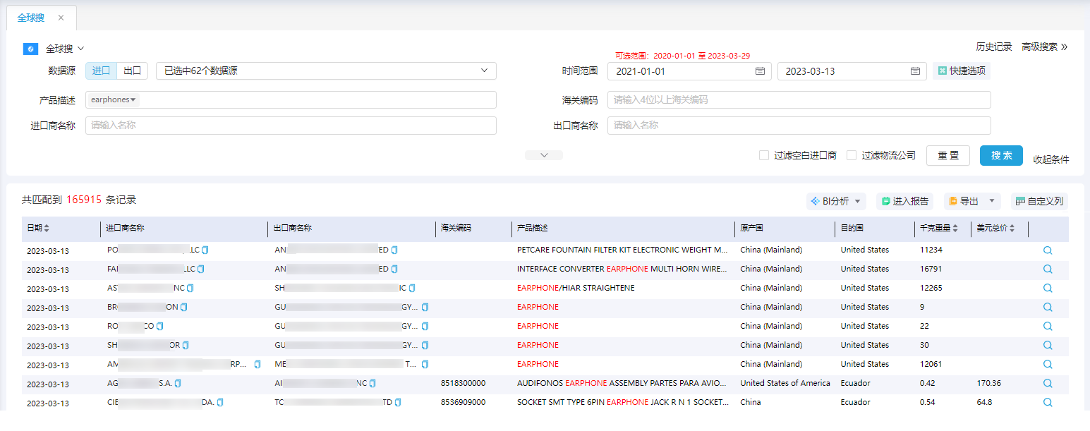3. 结合该核心产品的特点从EVO视讯官网外贸通中,找出采购earphones的买家及其交易记录,顺利获得分析采购动态、交易趋势、供应链,竞品特点等等,有针对性的去挖优质潜客 。