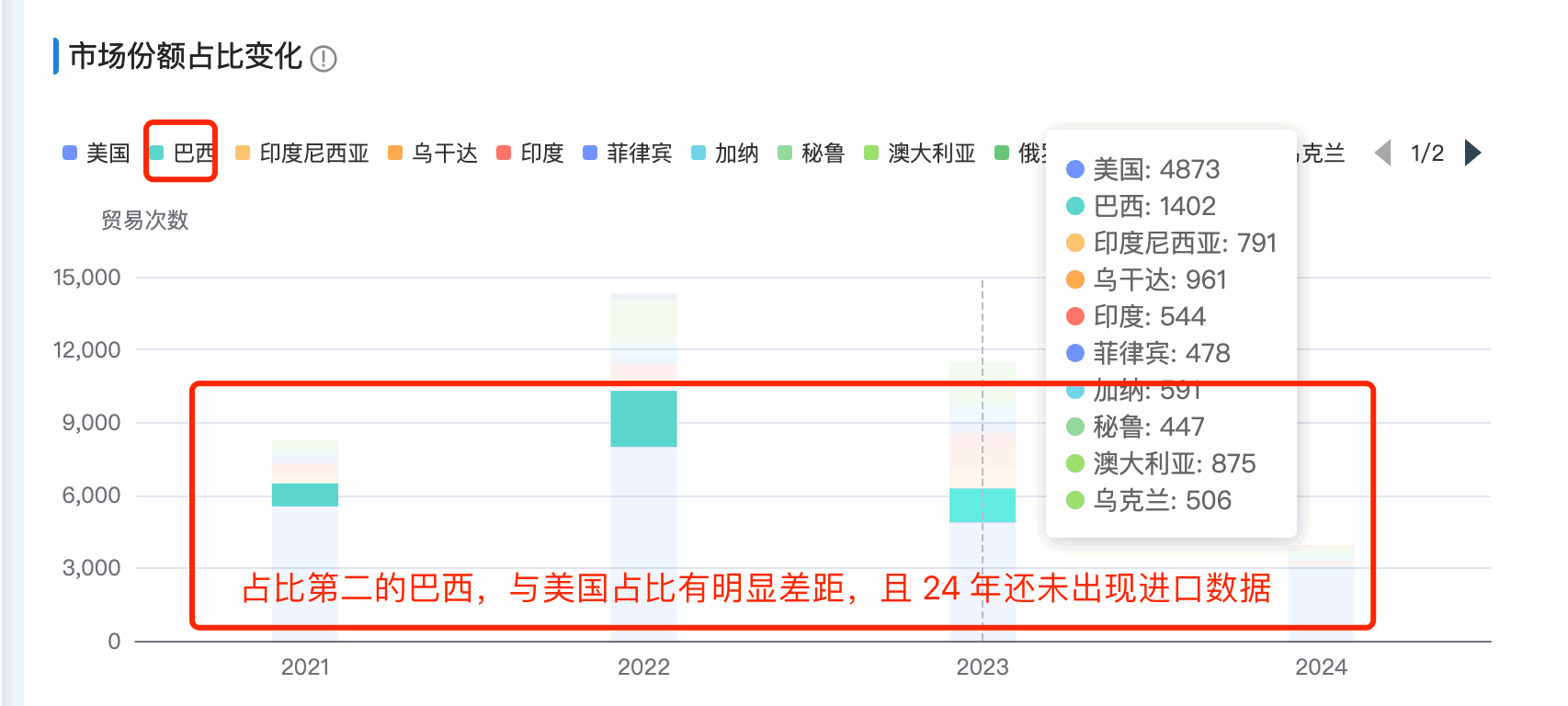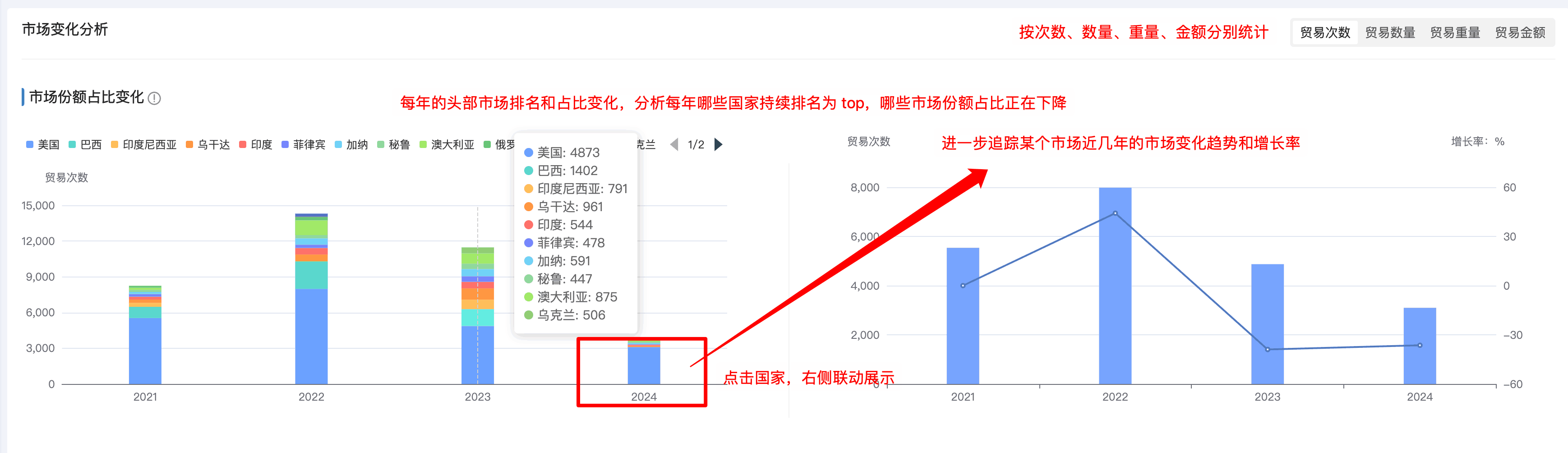 1. EVO视讯官网商情洞察市场分析新增「市场占比变化分析」:分析每年的头部市场的占比排名和变化,哪些市场持续排名在头部,哪些市场排名逐渐下滑甚至消失在top之外的。