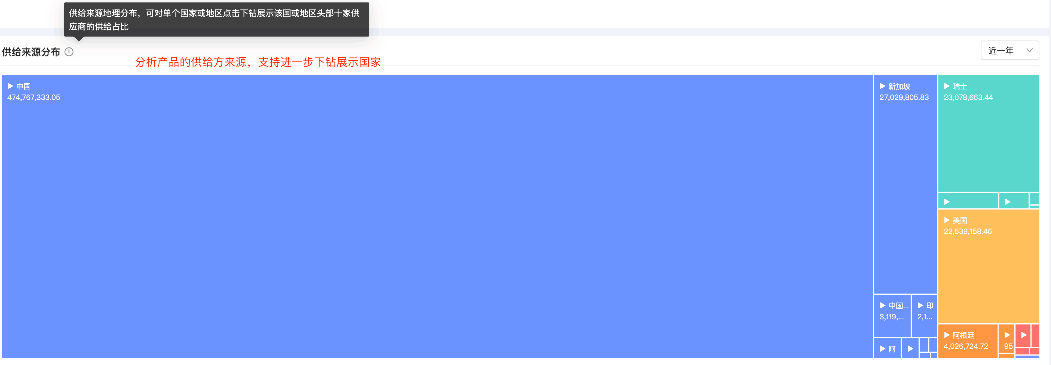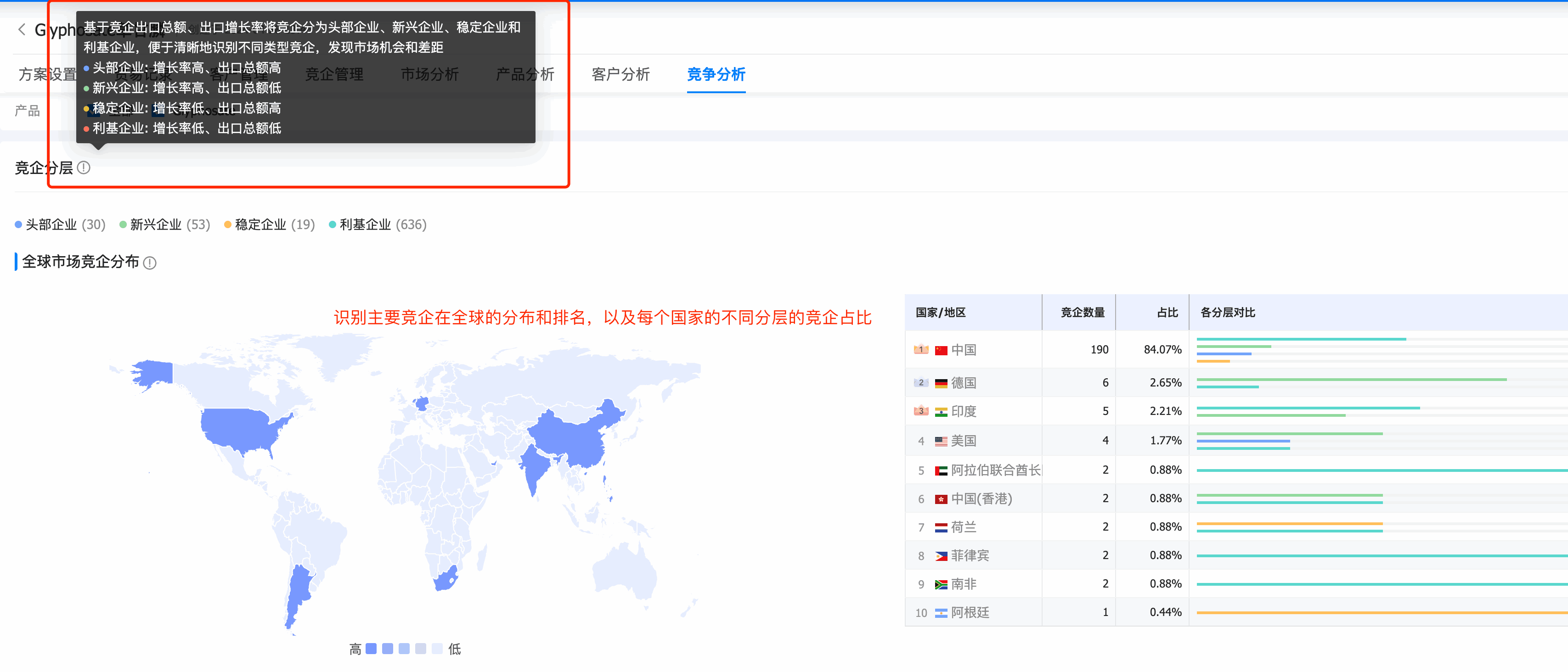 竞企分层明细直观地展现了各个分层的集中度,右边列表详细罗列了各个竞企的分层标签、所属国家、供应金额、供应增长率