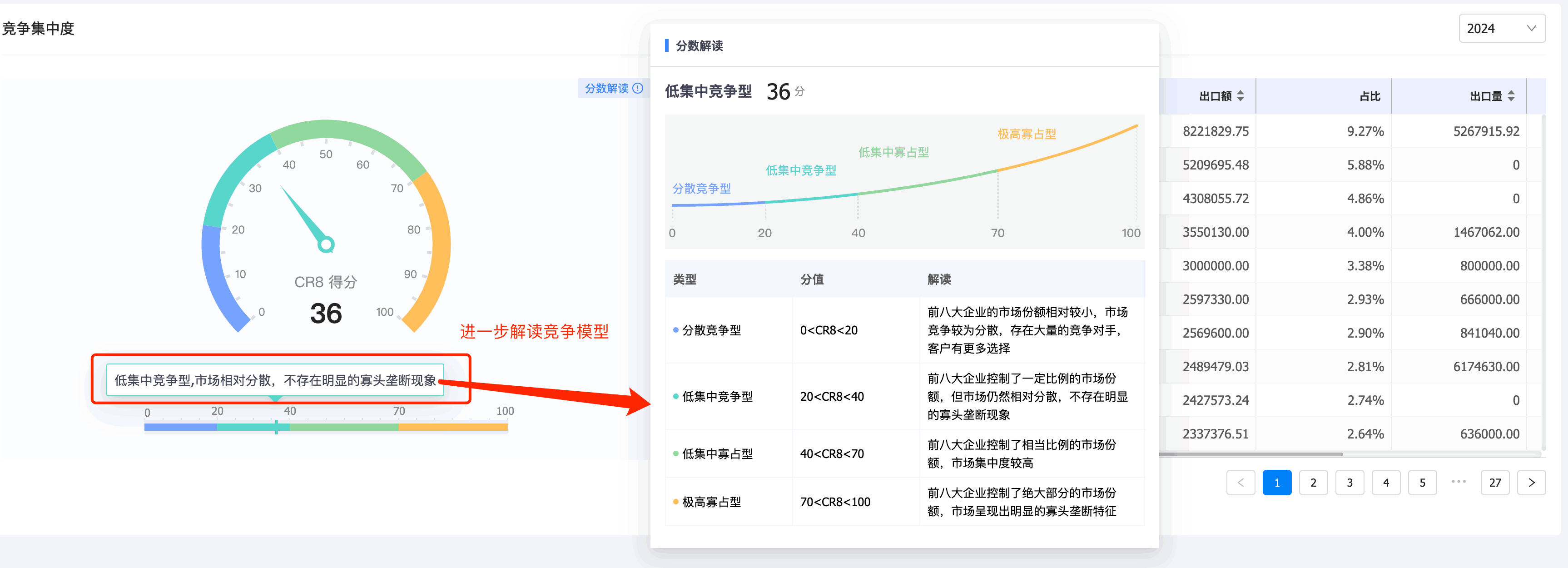 3. EVO视讯官网商情洞察竞争分析新增「竞争集中度分析」:基于行业集中度(Concentration Ratio)理论来计算目标产品竞企竞争集中度,出口目标产品前8家最大的企业所占市场份额的总和,是对整个竞争市场结构集中程度的测量指标