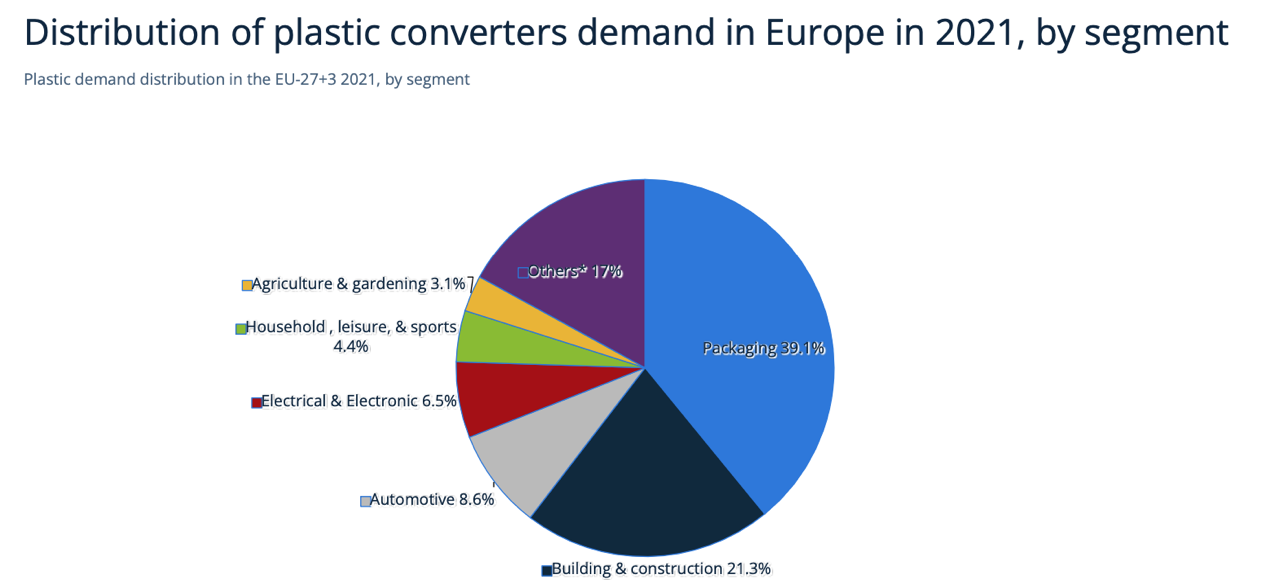 在行业需求方面,塑料广泛应用于包装、建筑、汽车、电子等多个行业。这些行业对塑料的需求量庞大且稳定增长。塑料在包装行业中的需求量最为突出,据欧洲数据统计,塑料包装在2021年占全部塑料需求39.1%的比例。同时,汽车和建筑行业的需求也在不断增长。