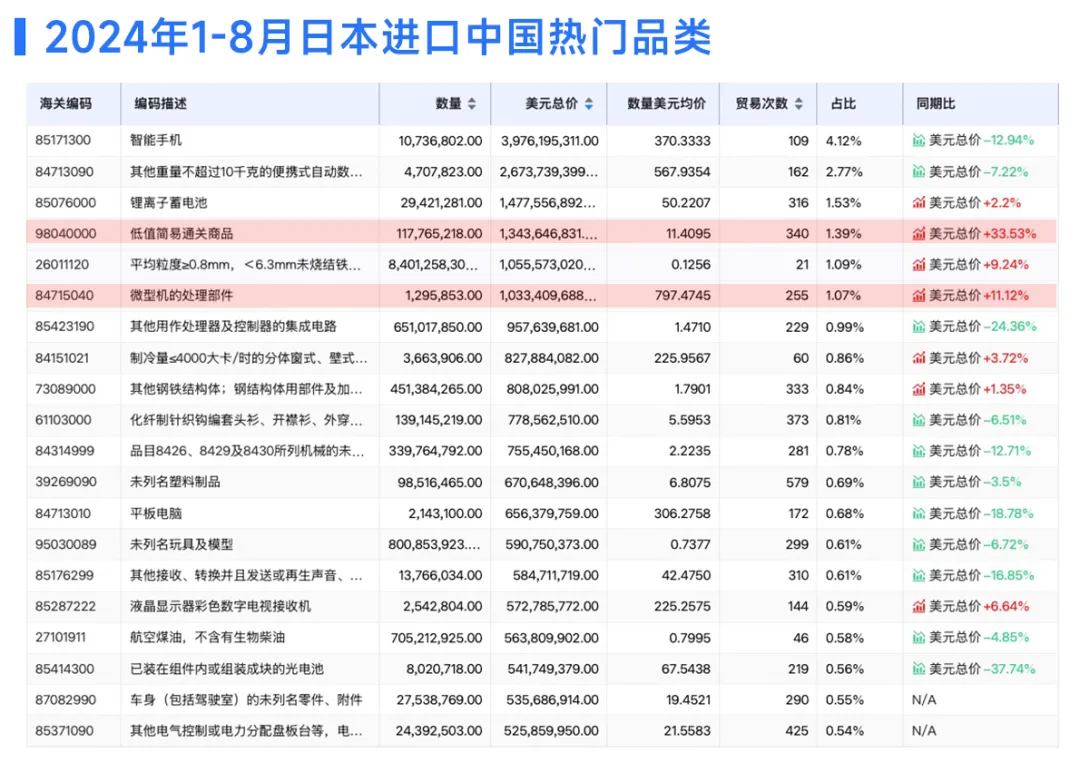 2. 低价值易消费商品此类商品(98040000)的进口数量最大,达到1.17亿件,总价13.43亿美元,同比增加33.53%。展现了日本对便宜日用品需求的增长。